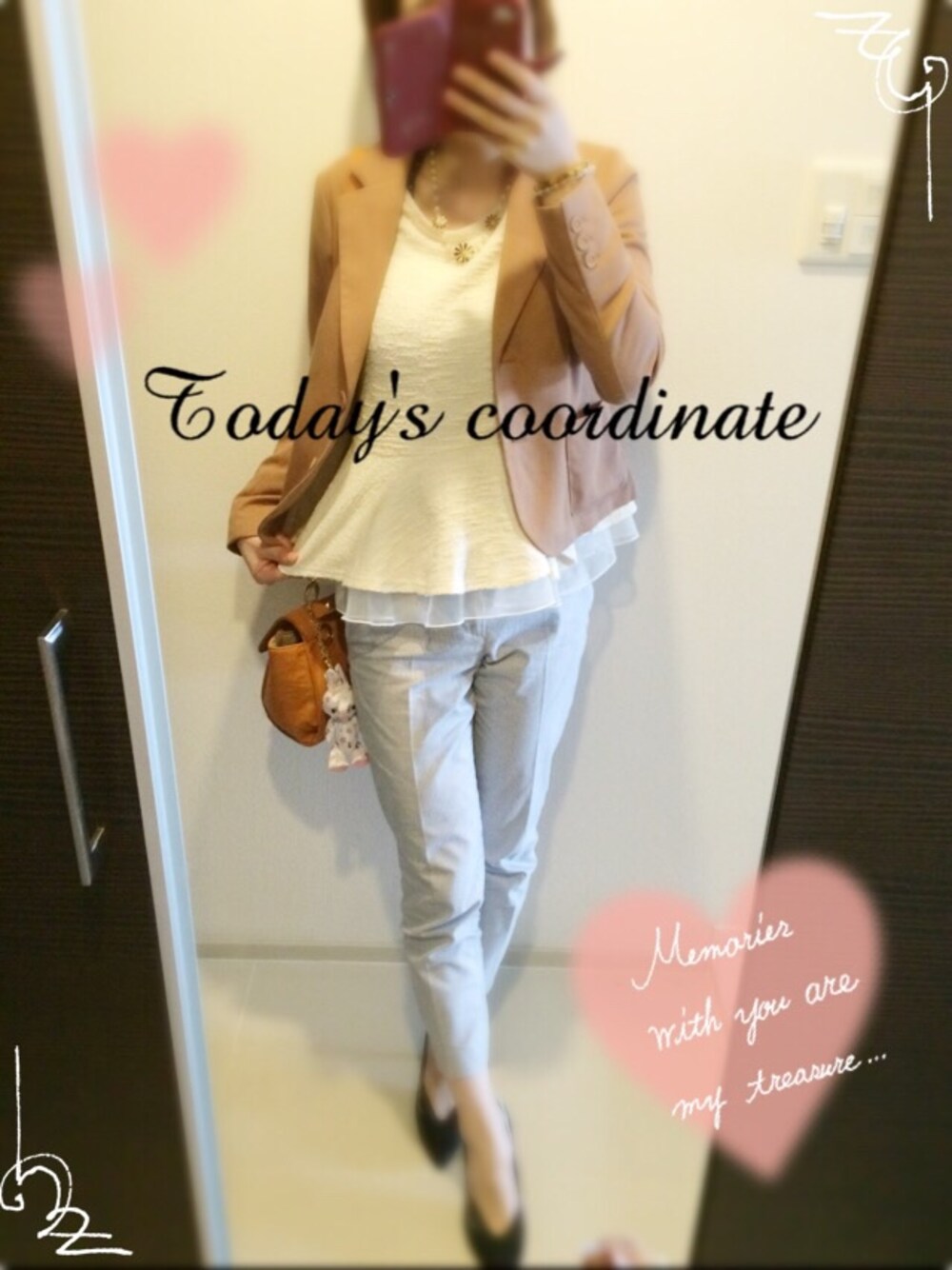ペプラムトップスは後半ちゃんから 誕生日プレゼントに貰った物♡o(^_^)o♡ 珍しくアクセも付けてみたり。 パンツは着まわしと言う名の手抜き。