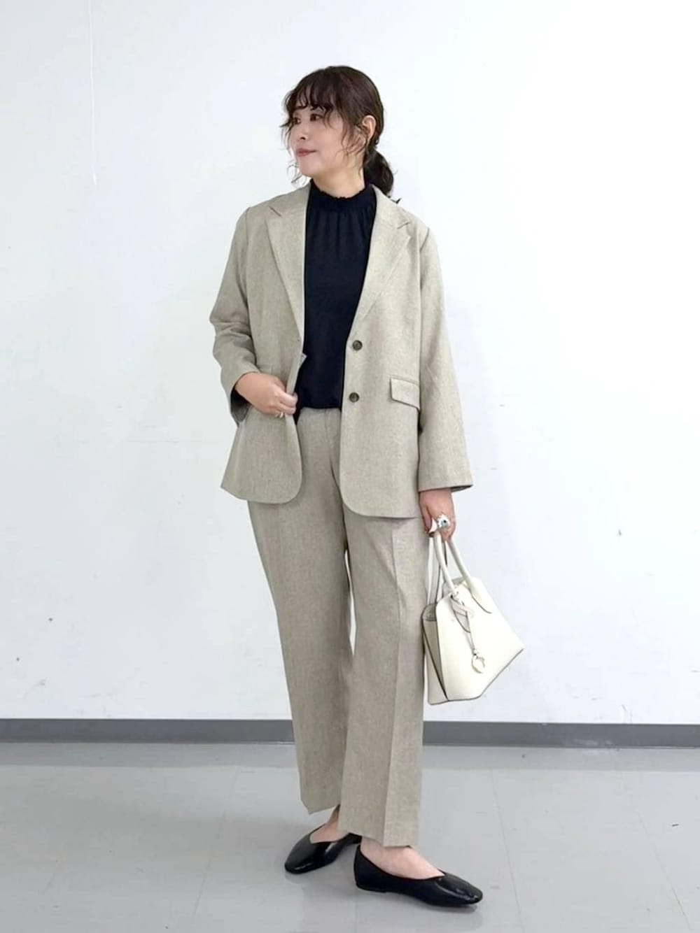 MATINEE LINE ツイードライク/シングルジャケット☺︎ 表情豊かなミックス調に織り上げたツイードライクな生地が特徴のシングルジャケット メンズライクなゆとりのあるシルエットを残しつつ、女性らしい抜け感をプラス ストレッチが効いているので、ストレスフリーで着ていただけます 同素材のストレートパンツとセットアップで合わせました