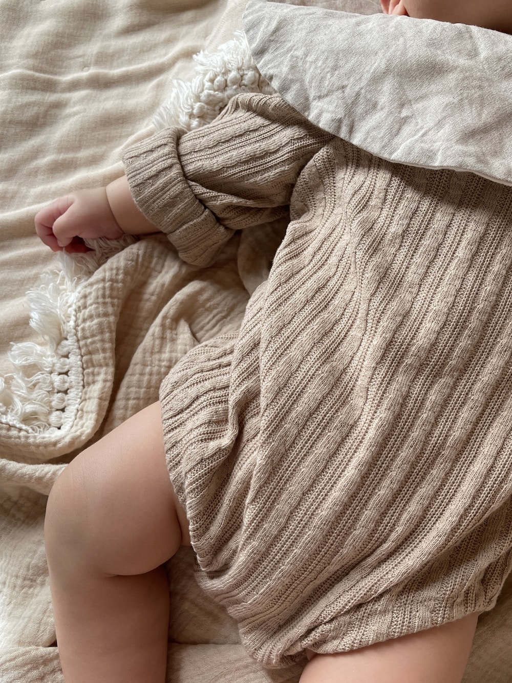 ベージュ系のロンパース、ホワイト系のスタイ/よだれかけを着用したキッズの秋コーディネートの1枚目の写真