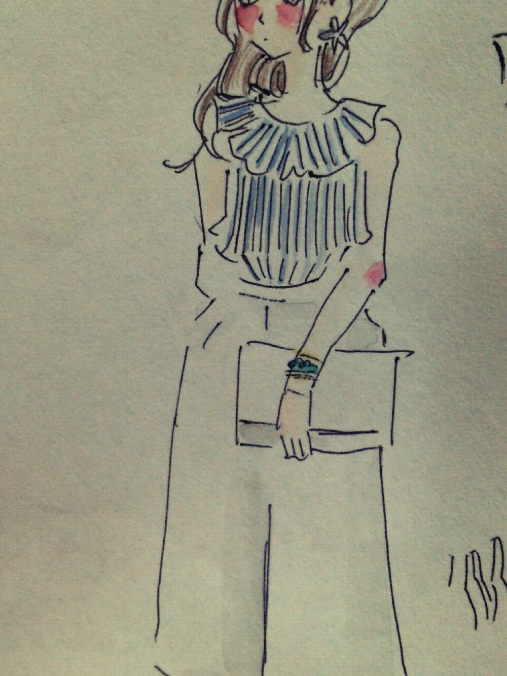 ホワイト系のパンツ、ブルー系のトップスを着用したレディースの秋コーディネートの1枚目の写真