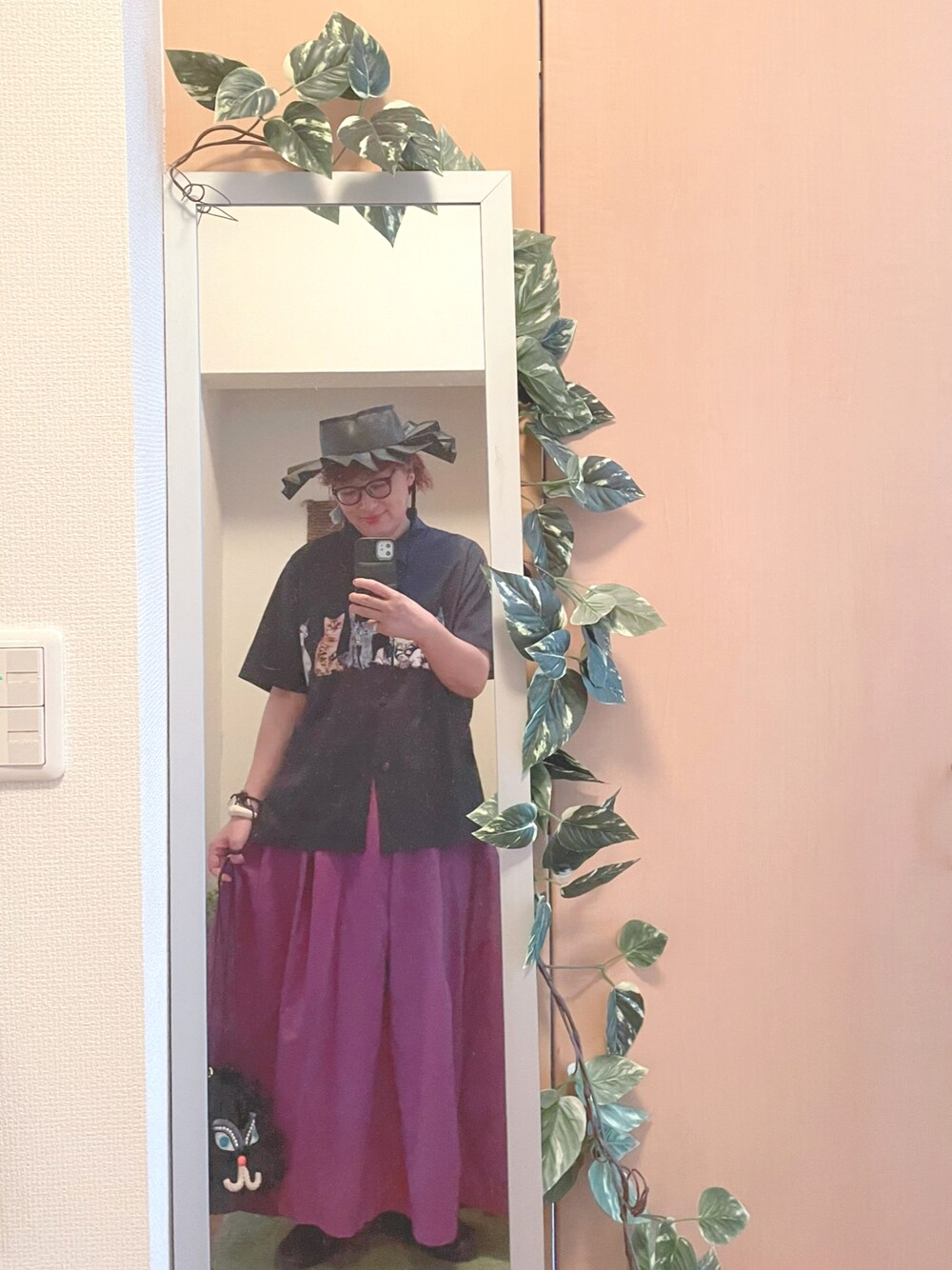 黒と紫。 なんとなーく 久しぶりにスカート。 猫のシャツに 猫のバッグ。 さぁ。 久しぶりの3連勤。 今日で終わるー。