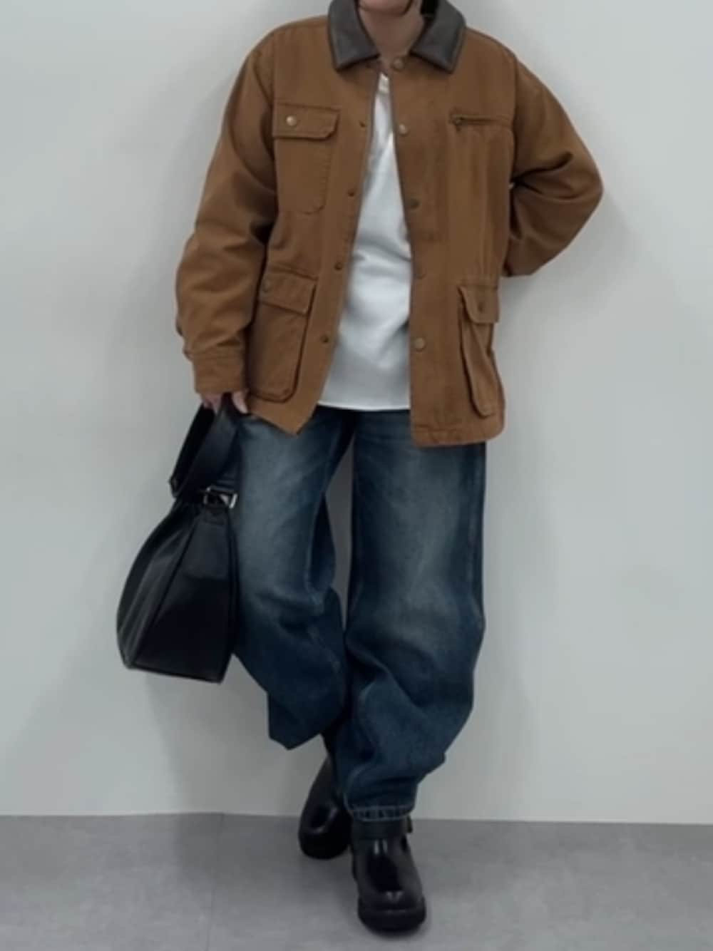 155cm 骨格ストレート 【アウター】 ・秋冬のカジュアルコーデに欠かせない、メンズライクなハンティングジャケット。襟元のコーデュロイ切り替えがポイントになって可愛いです! ・骨格ストレートが得意なハリのあるしっかりとした素材感。オーバーサイズですが、肩のラインが落ちすぎていないので、着膨れせずすっきりと着られました! ・155cmでお尻がすっぽり隠れる丈感です。前を開けて中の白トップスを見せることでIラインが強調され、スタイルアップ効果も狙えます◎ 【トップス】 ・アウターの中にシンプルな白のカットソーを合わせることで、顔周りをパッと明るく見せ、重たくなりがちな冬コーデに抜け感をプラスしました。 【ボトムス】 ・骨格ストレートが大得意なハリのあるデニム素材のワイドパンツ!肉感を一切拾わずに、ストンとした綺麗なシルエットを作ってくれるので着痩せ効果抜群です! ・155cmだと丈が長めで裾にクッションができるので、ボリュームのあるブーツや厚底シューズを合わせてバランスを取るのがおすすめです💭 【シューズ・バッグ】 ・小物は黒のレザー調アイテムで統一して、カジュアルなデニムコーデを大人っぽく引き締めました。 ・ボリューム感のあるブーツは、ワイドパンツの存在感に負けず、全体のバランスを整えてくれます。