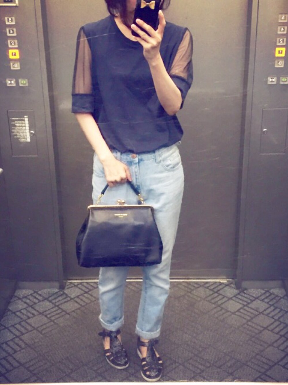 シースルーのトップスをデニムパンツでカジュアルな感じで!! なかなか撮り慣れません、、、。