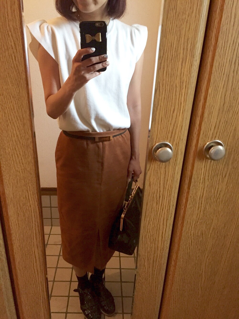 スカートはスウェード素材。 秋先取りです〜。