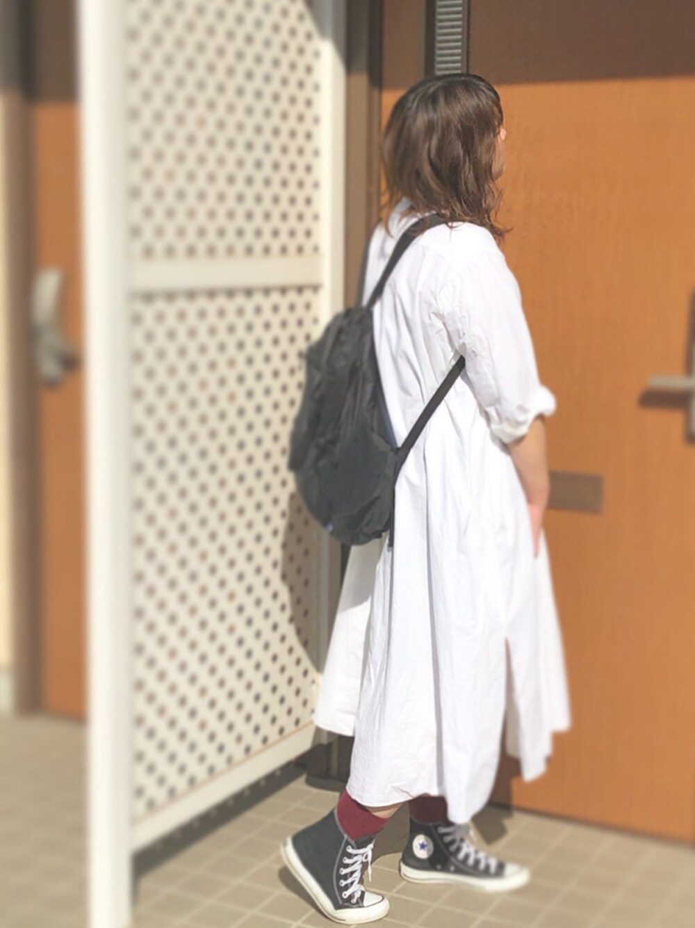お気に入りのワンピースをスニーカーとバックパックでアウトドアMIX🌲 Instagram → @e_tam0312