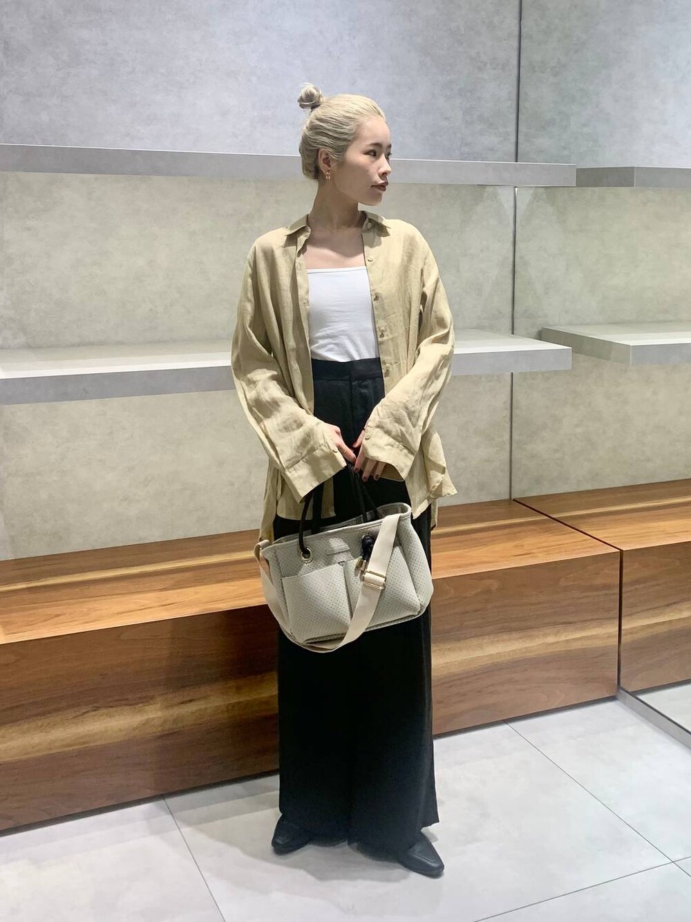 リネンでまとめたスタイリング☆ おしゃれカラーのベージュのリネンシャツは 羽織るだけでサマになります。 大きめサイズを選んでマニッシュに着ても気分です◎