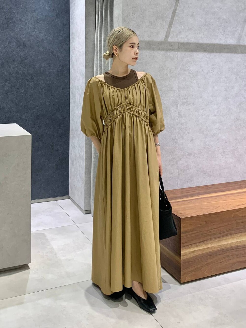 ギャザーたっぷりの贅沢なワンピース♪ アメスリを仕込むとカジュアルさも出て抵抗なく着れました◎