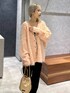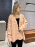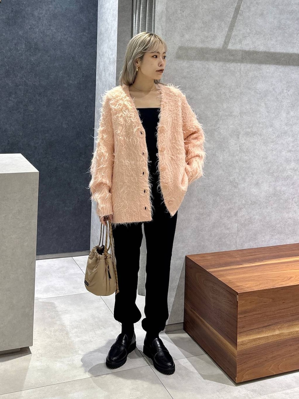 春にも着れるフラッフィーカーディガン♪ 春らしいカラーでスタイリングしてみました♪ 明るめのオレンジピンクなので インナーとパンツは黒でまとめて大人な印象に◎