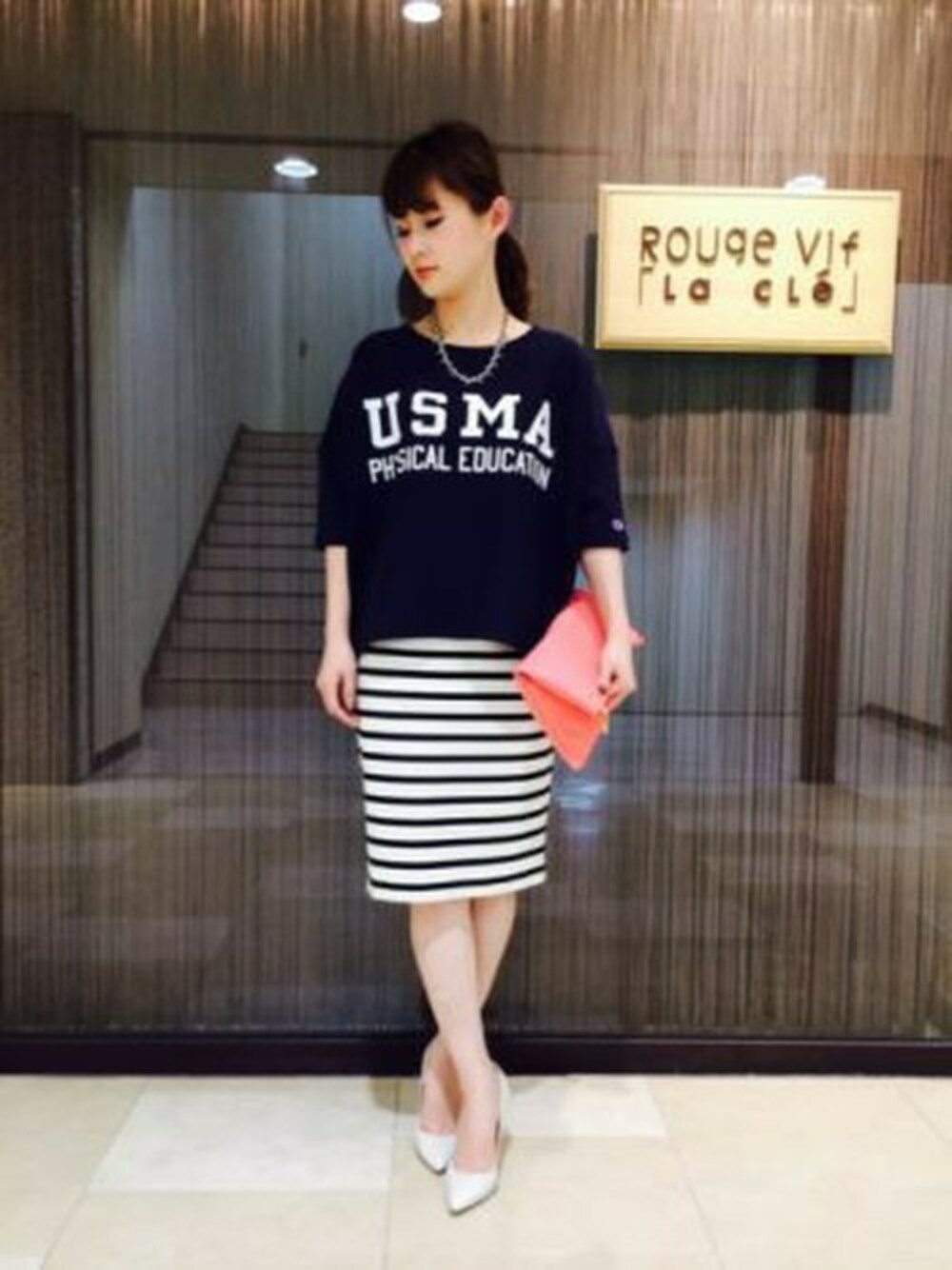 ざっくりとした7分丈のChampion別注Tシャツはタイトスカートと合わせてカジュアルキレイメに♪