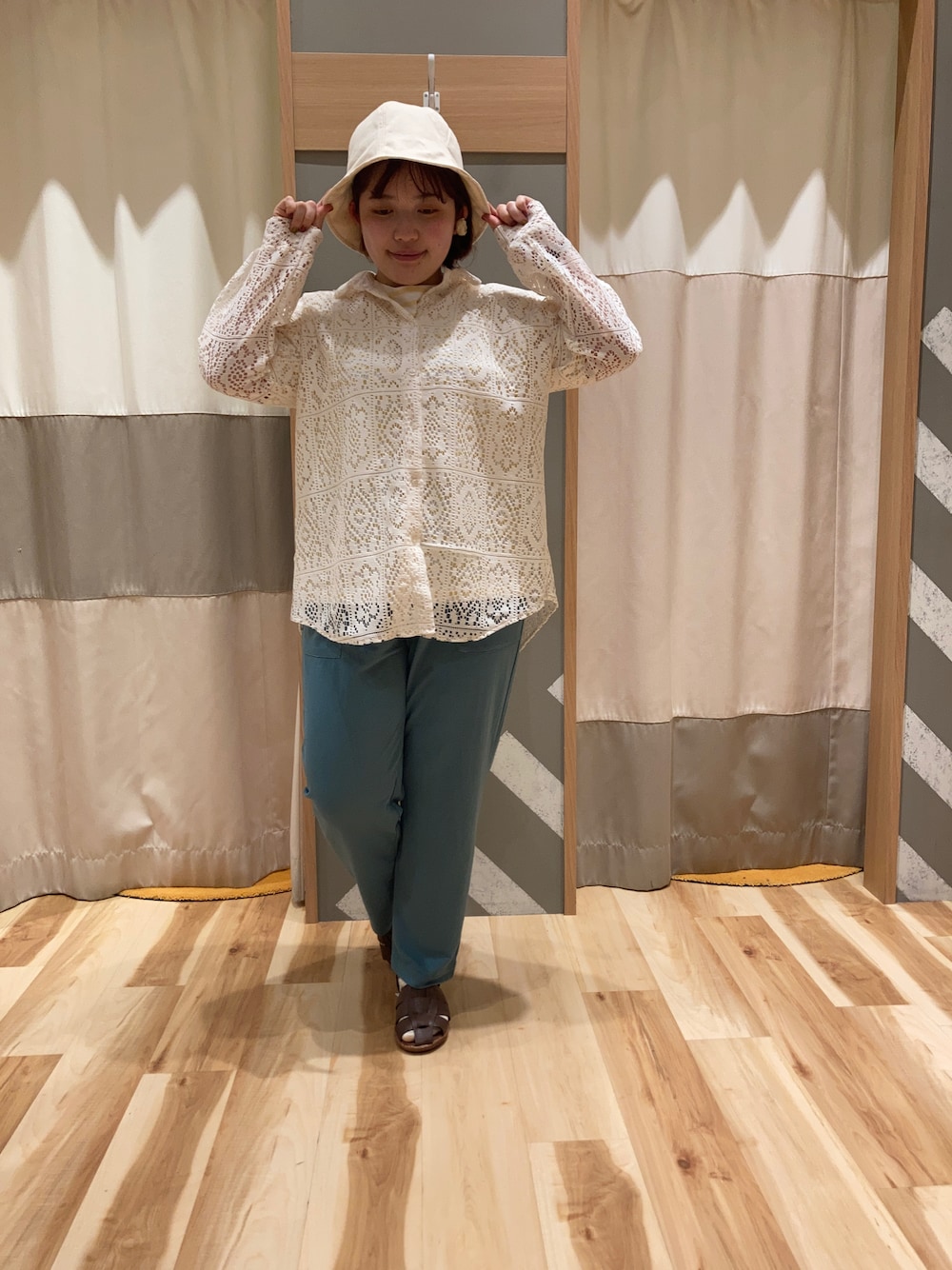 レースシャツブラウスは普段使っているTシャツの上に羽織るだけでお出かけ着にできます。 ボーダーTシャツはシンプルなデザインなので羽織やベスト等を合わせやすいです。 パンツはサラッとした素材で総ゴムなので楽に、涼しく着ることができます。 チューリップハットは形が丸いので雰囲気を柔らかくしてくれます。