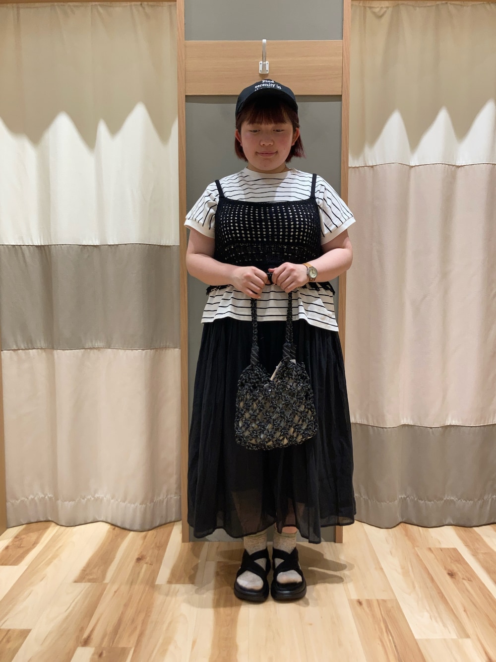Tシャツはフレンチスリーブなのでインナーとしてもお使い頂けます。綿100%なので肌触りもよく、吸水性もあるので夏の暑い日でも快適にお使い頂けます。 ビスチェはトレンドのフリンジを取り入れたカジュアルなデザインになっています。カジュアルなコーディネートやトレンドを取り入れたい時におすすめです。ビスチェはワンピースなども相性が良く、コーディネートの幅が広がります。 スカーチョはインド綿でさらりとした肌触りです。通気性も良く、パンツですがスカートのようなふんわり感で体型カバーもしてくれます。 キャップはシンプルなロゴ刺繍で後ろのベルトで好きなサイズ感に調節できます。カジュアルはもちろん、キレイめなコーディネートでも合わせられます。 サンダルは柔らかいベルトで楽に履けます。ベルトはナイロン素材でアウトドアやカジュアルなコーディネートに合わせやすいです。厚底でしっかり支えてくれるので足のダメージが少ないです。 バックは巾着付きで別々にもお使い頂けます。トレンドのメタリックカラーの巾着とコードマクラメバックは夏にぴったりなイメージです。