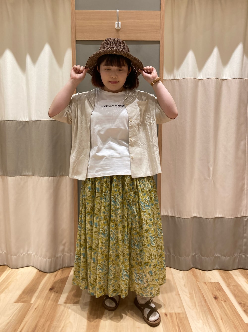 開襟シャツはリネンで涼しく、ビックシルエットでボタンを開けて着ても閉めて着てもゆるりと着ることができます。 インナーのTシャツはフレンチスリーブなのでキャミワンピースのインナーにもお使い頂けます。ロゴ刺繍でカジュアルダウンしにくいです。 スカートはインド綿で通気性がよく夏にピッタリです。ペイズリー柄もアクセントになりワンピースのインナーもできます。 サンダルは履きやすい柔らかいベルトでクッション性のあるもあるので足が疲れにくいです。テイストもこだわらず合わせやすいサンダルなので着回ししやすいです。 ハットは夏らしいペーパーハットで濃い色味もあるのでコーディネートのアクセントになります。 ペイズリー柄が入ると夏らしいコーディネートになります。トップスの開襟シャツもリネンなので涼しくお使い頂けます。