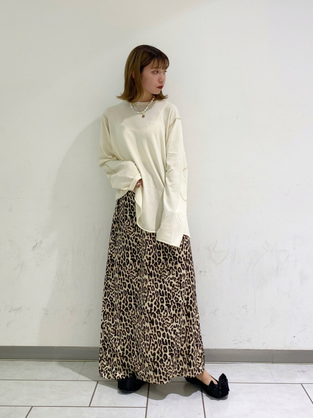 女性らしいAラインのスカートに、オーバーサイズのニットを合わせてみました🌿 スカートはウエスト部分がゴム仕様になっており、ラクな穿き心地です! ブラウスやシャツなどと合わせるもの◎