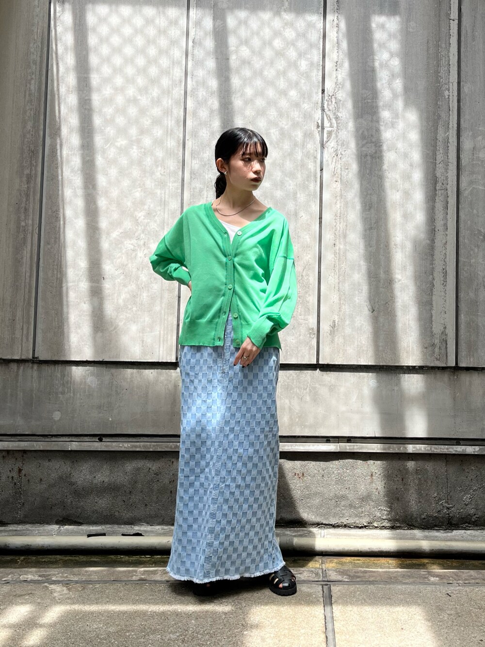 ブロックチェックのデニムスカートは、他にはないKBFらしいデザインで穿くだけでオシャレにみせてくれます💖 鮮やかなグリーンのカーディガンで春らしいコーディネートにしました🌱
