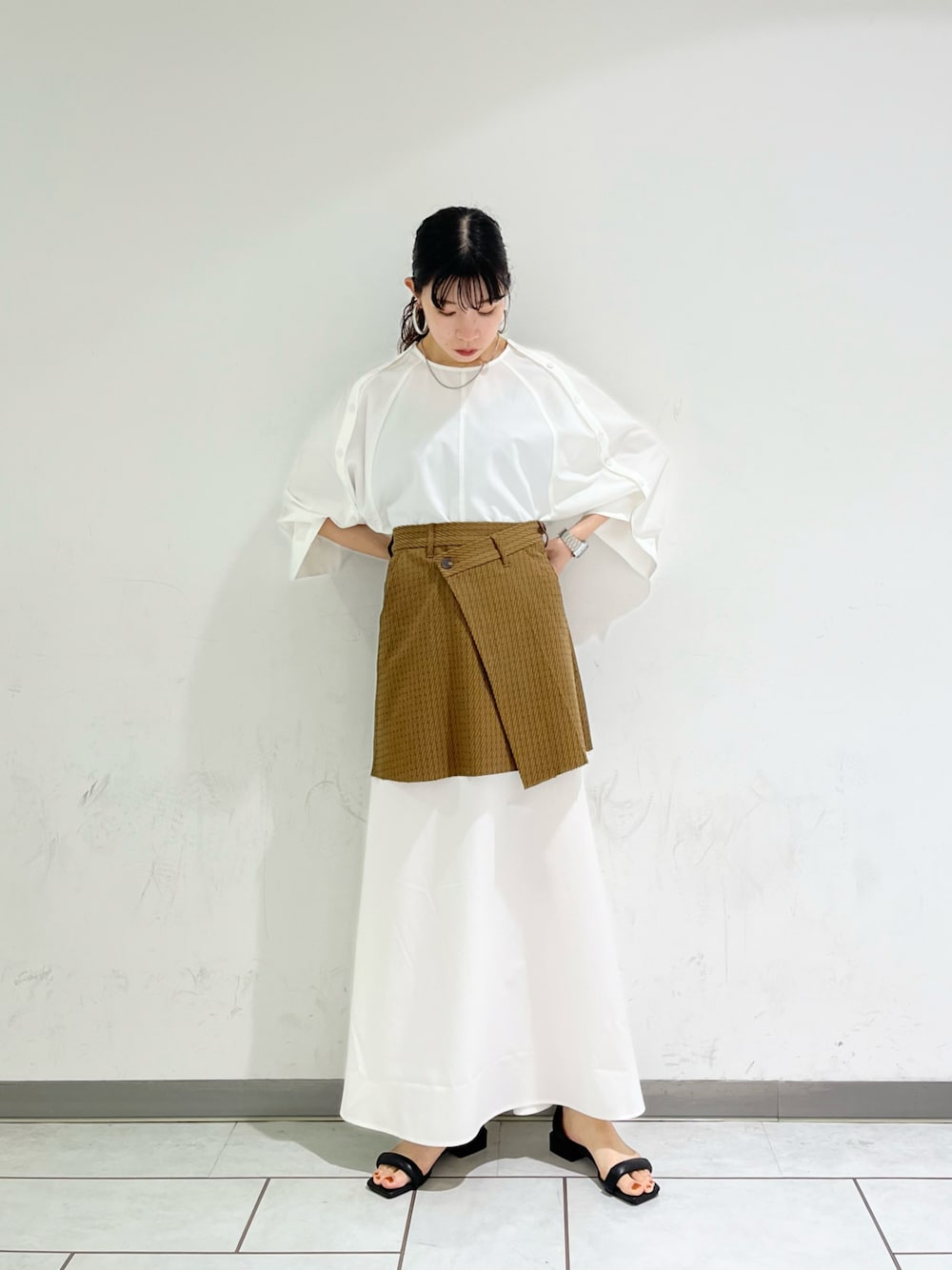 シャツワンピにミニ丈のスカートをレイヤードしました! スカートは一枚着でももちろん可愛いですが、ワンピースやデニムと合わせるのもお勧めです🙆🏻♀️