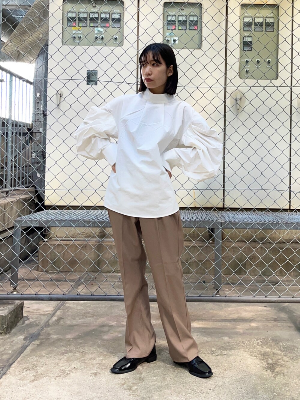 袖にかなりボリュームがあるので顔周りとウエスト部分はスッキリ見えます💖 シンプルにベージュのパンツとローファーで秋っぽいコーディネートにしました🤎