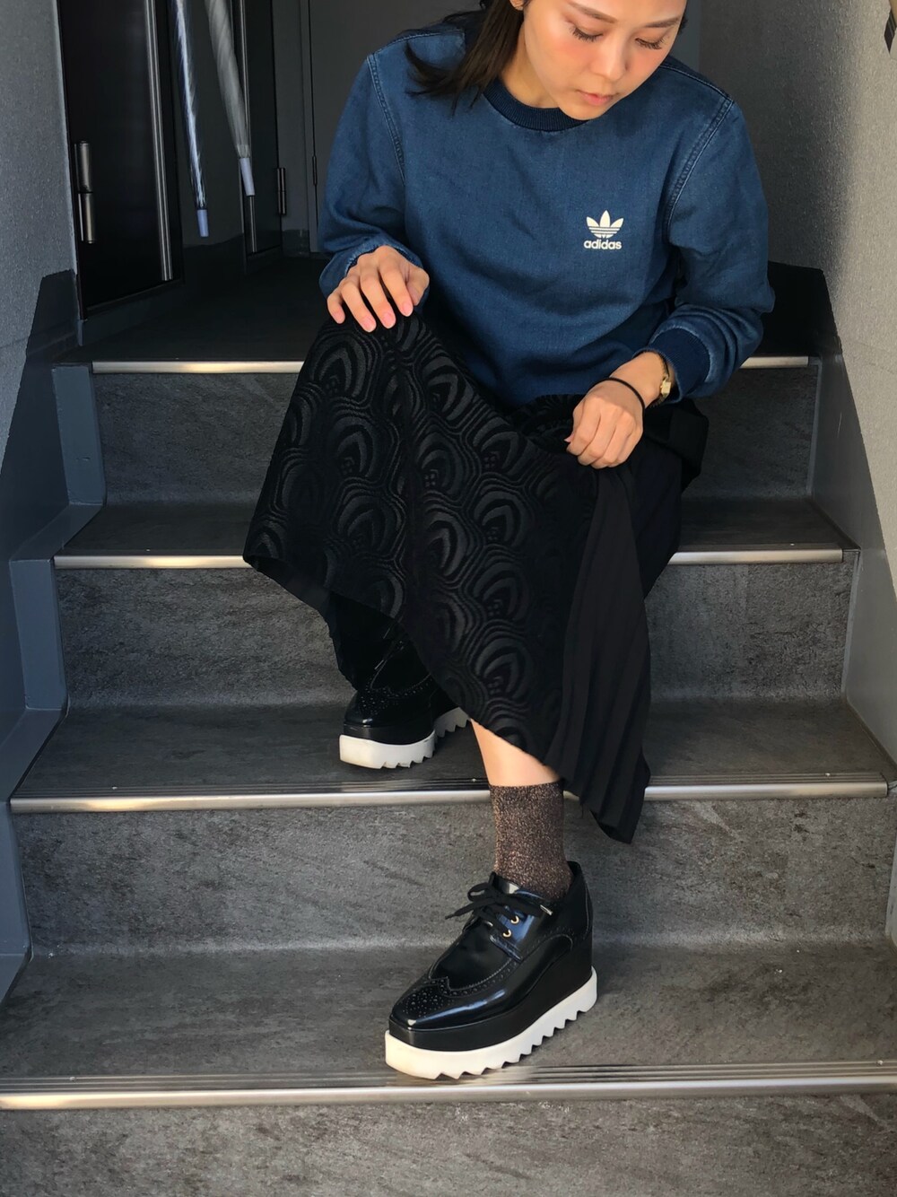RIM.ARKのスカートがとっても上品なので、アディダスで抜け感ー これで自転車通勤🚲
