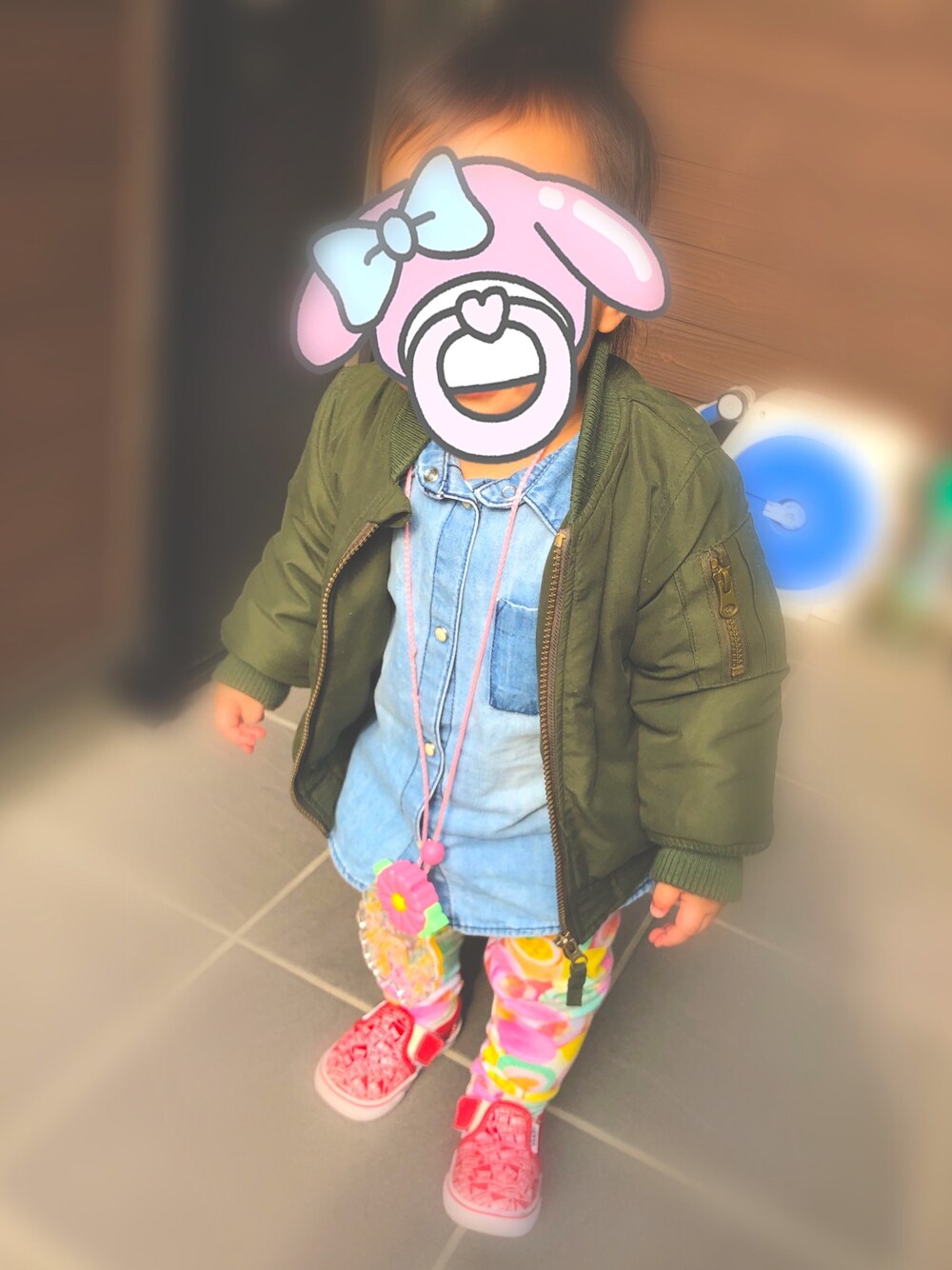 デニムシャツ×フルーツレギンス ボーイッシュになってしまうのを フルーツレギンスで女の子らしくしてみました! ラプンツェルのライトはお気に入りでよくぶら下げています(笑)