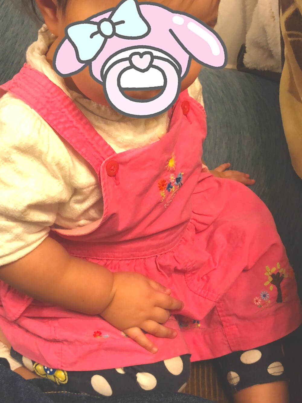 フリマアプリでGETした オシュコシュのピンクサロペ🙌 可愛くてどうしても着せたくて 外でれないけどお家で着せてみました😊