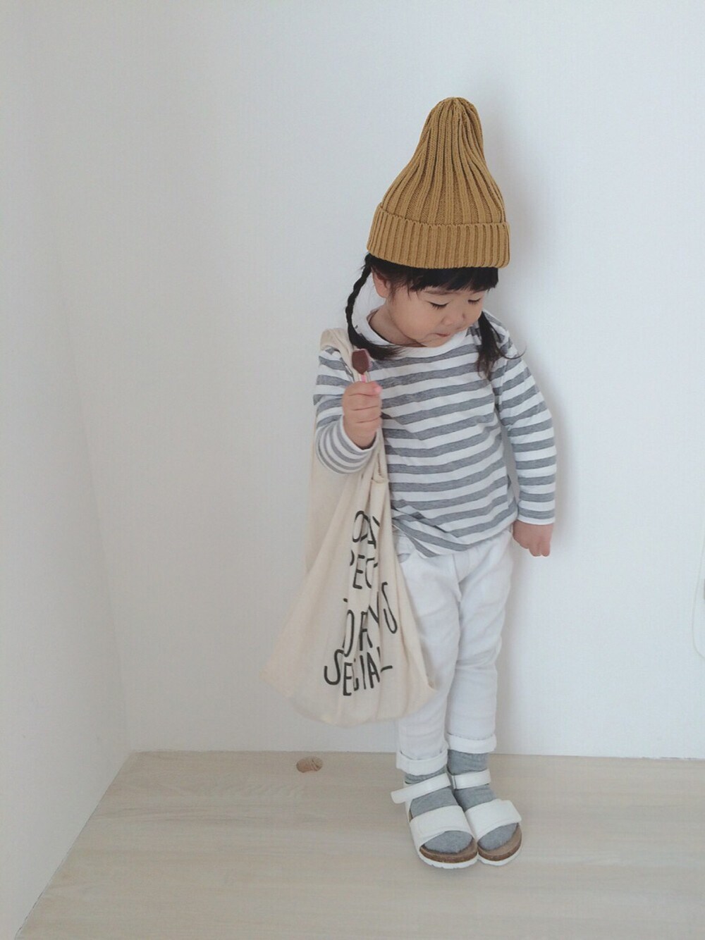 グレー系のTシャツ/カットソーを着用したキッズの冬コーディネートの1枚目の写真