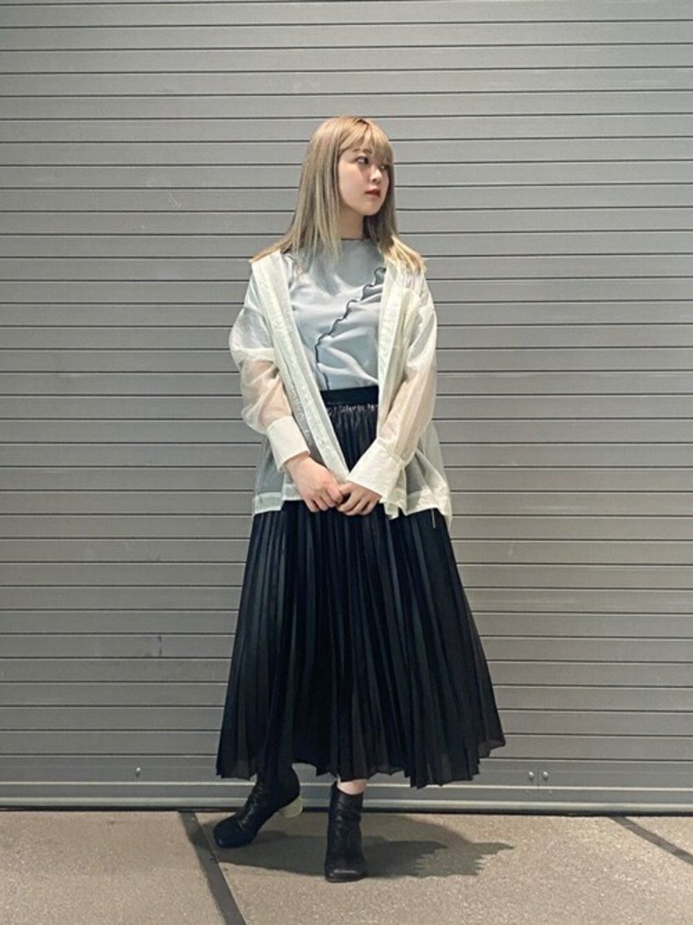 シアーシャツは後ろスリットが可愛い!タイトめカットソーもシアーシャツを羽織れば長い時期着れます。プリーツスカートは黒なのにシアーで重たくならないです。着心地も軽い!