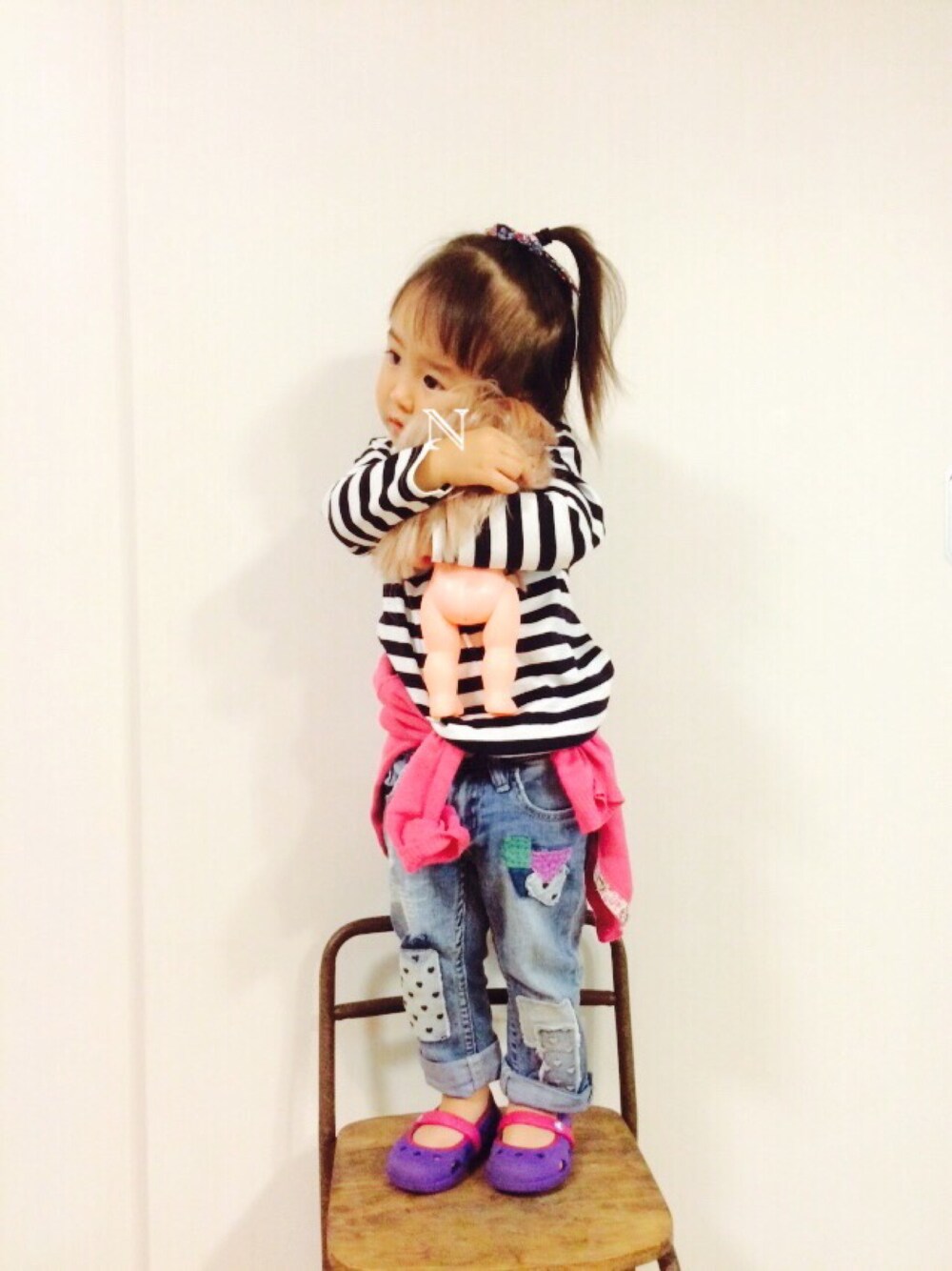 non☆coordinate メルちゃんと撮る〜と離しません😓 まぁいいけど、洋服が見えません… デニムは程よいゆとりで履きやすい☆ハートのクラッシュ加工を自分でリメイク👖