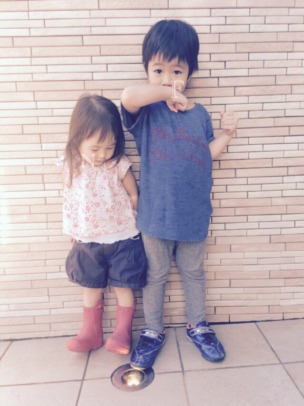 huku&non☆コーディネート huku☆SALEでゲットしたしまむらTシャツ500円✨刺繍の英文字がいい具合です^ ^ non☆ボントンのシャツに合わせてかぼちゃパンツを選びました🎀 シャツ一歳用だけどまだ着れます☆彡