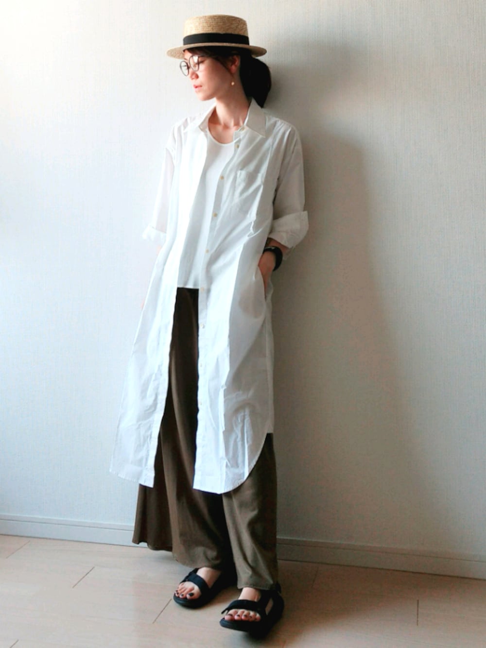 ご覧頂きありがとうございます 『ホワイト × ダークカーキ』 あぁ、安定のすまし半目←おーちゃん? スーパーワイドパンツ、お直ししたから 着たくなり トラさんばりのおっさんコーデで失礼いたしました。