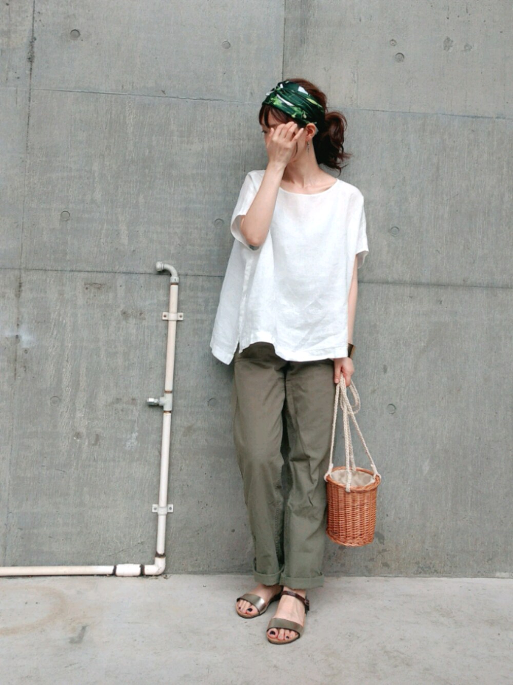 ご覧頂きありがとうございます 『ホワイト × カーキ』 大きめリネンブラウスにベイカーパンツ。 あら?昨日と同じ色合わせ。 アースカラー好きなのね。 わたし🙊