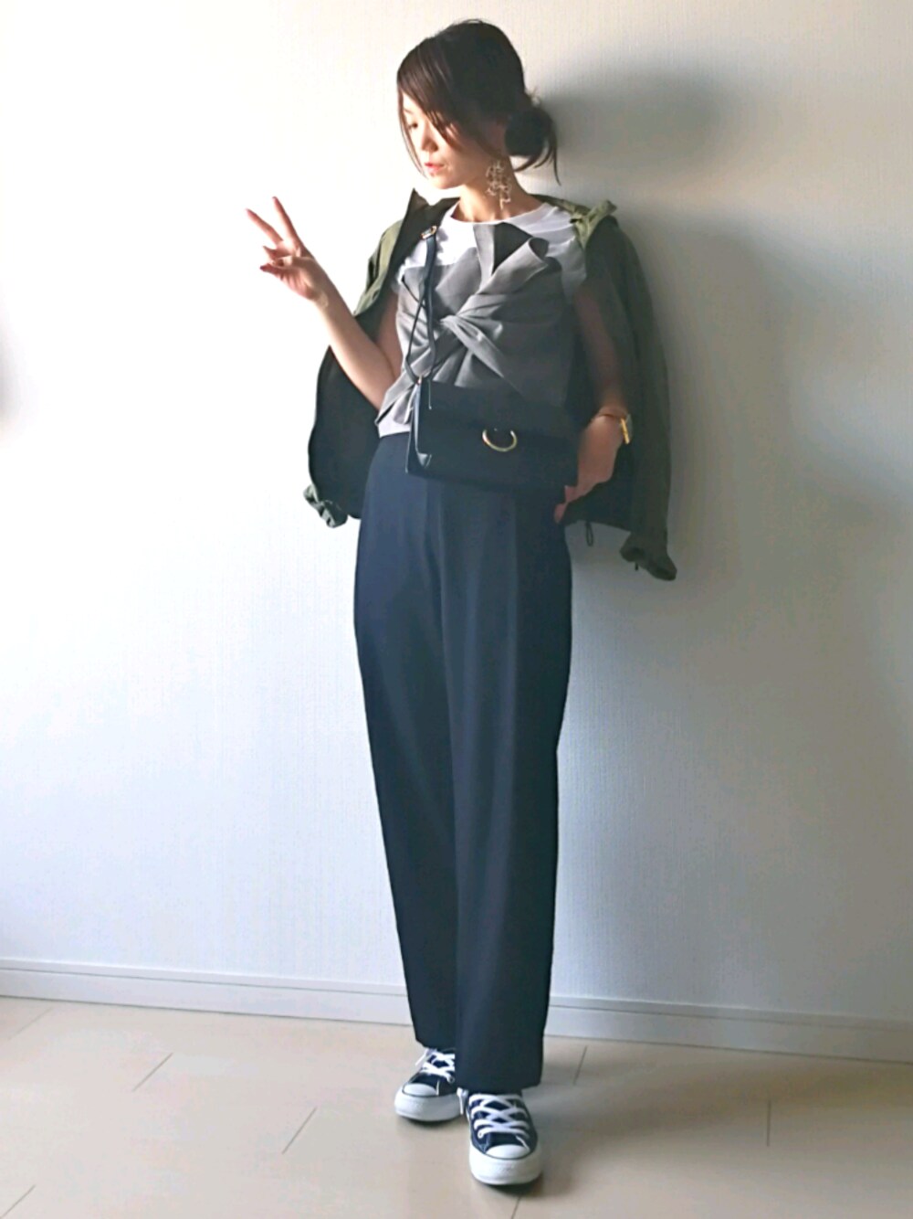 ご覧いただきありがとうございます 『モノトーン × カーキ』 NOISEMAKERさんの グレンチェックのビスチェ風Tシャツ 存在感ありありですが 実は何にでも合う 本日は 大人っぽくモノトーン合わせに ウィンドブレーカーでちょい崩し。