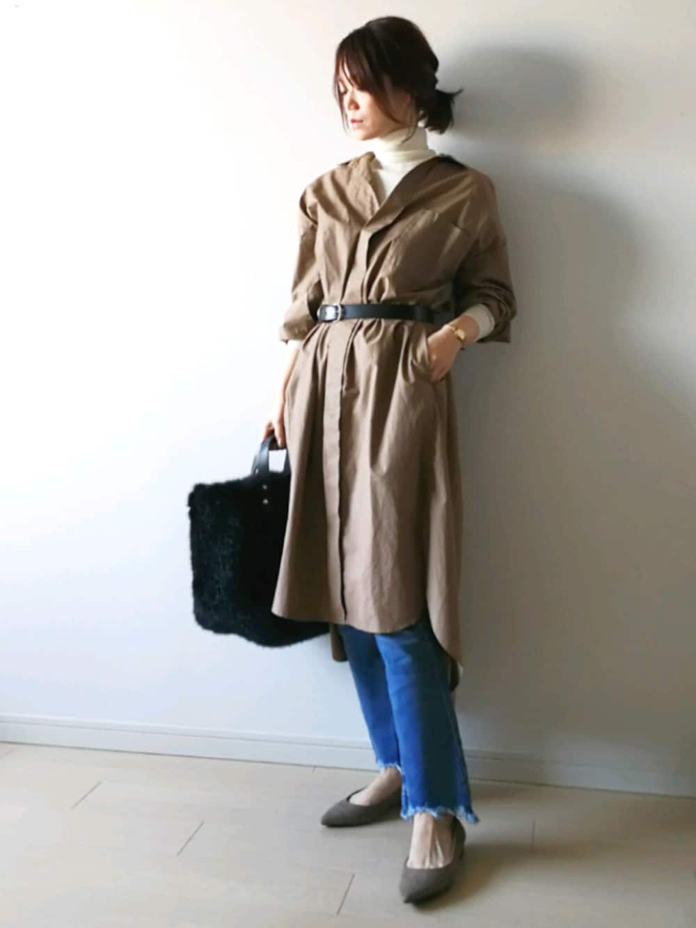 ご覧いただきありがとうございます 『ベージュ × ブラック + デニム』 テンベアのもふもふ くまさんバッグをゲット☆ シャツワンピにタートルインで 上着いらずな暖かさ