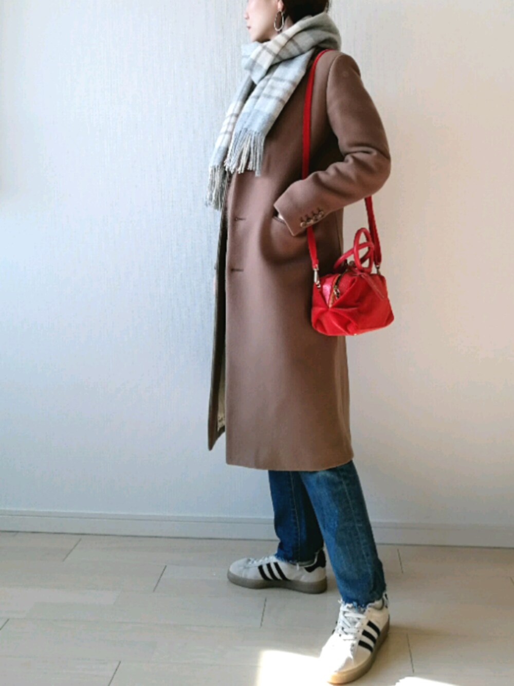 ご覧いただきありがとうございます 『ベージュ × デニム』 オレンジバッグがアクセント