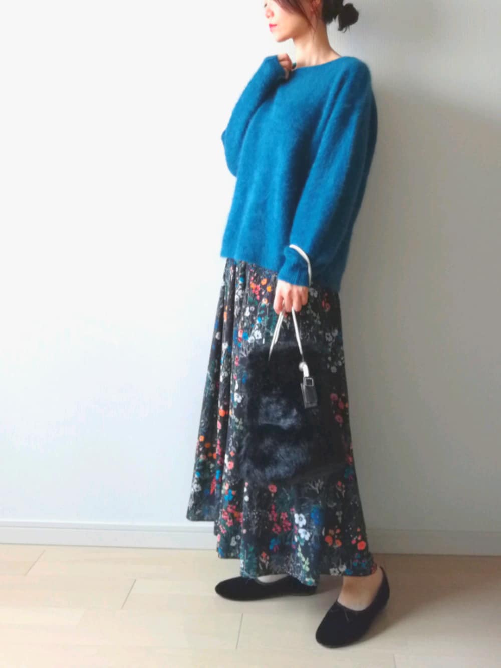 ご覧頂きありがとうございます 「ブルー × ブラック ボタニカル」 たまには鮮やかなブルーのニットも。 少し黄味のあるぶるーだから イエローベースの私にも許容範囲