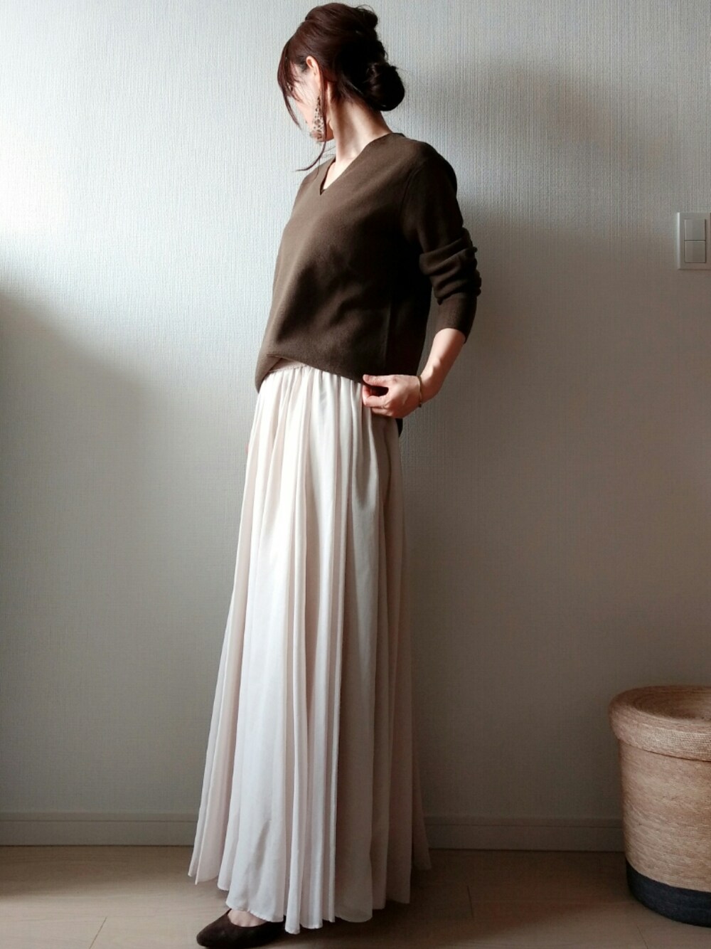 UNIQLO Uにて、ミラノリブのニットを購入! ゆったり着たかったのでMサイズにしました。 さすがにルメールさんの手が入ったシリーズは計算されたシルエットとスモーキーなニュアンスカラーが豊富でとても好み! これからの展開が楽しみです。 本日は2wayのワンピースをスカートにして。 ピンクっぽいベージュで秋色と相性◎です。