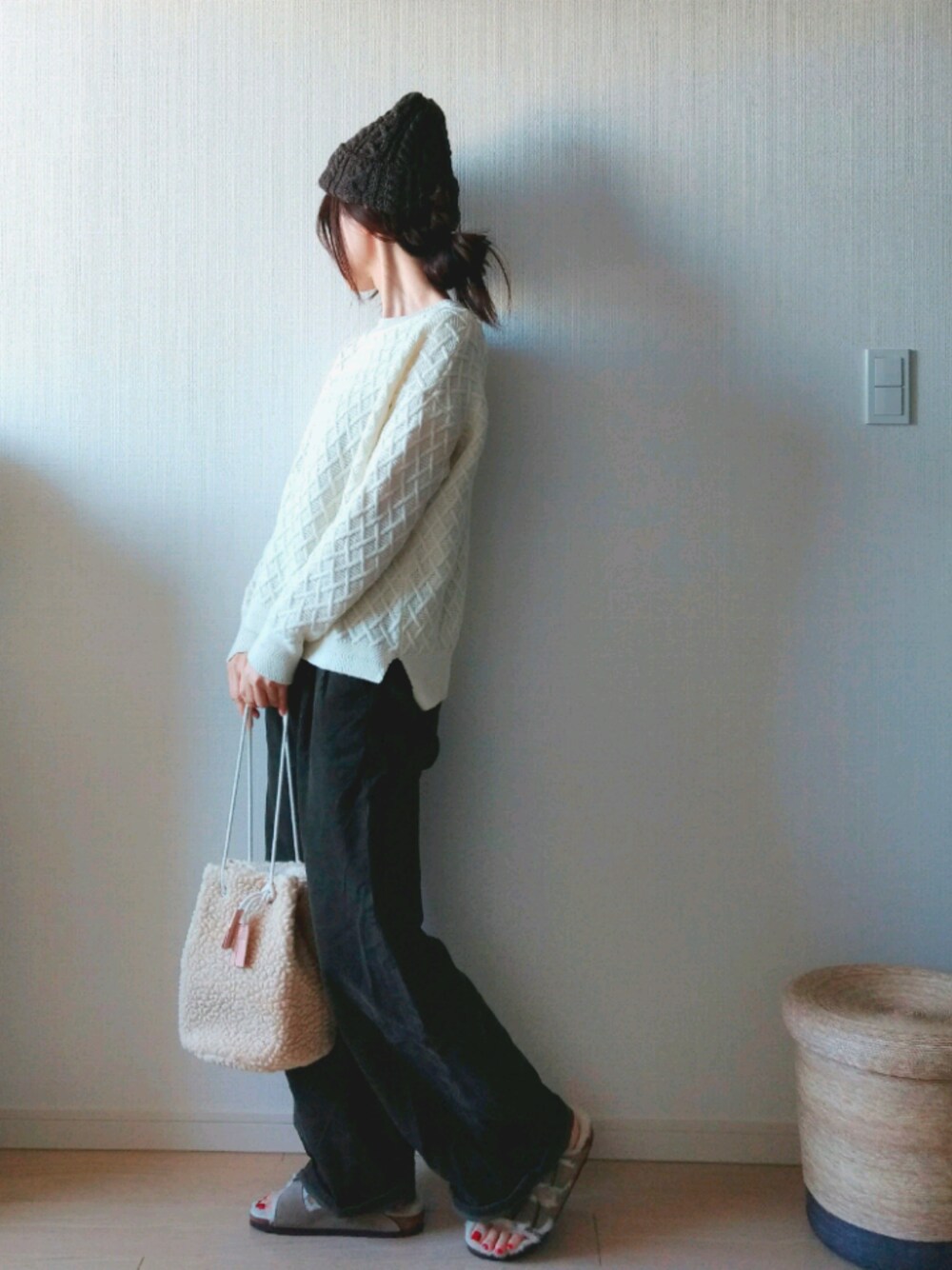 『ホワイト × グリーン』 一歩間違えると木こりっぽくなる ニット帽とコールテンパンツの組み合わせ。 ところが テンベアのボアバッグを持ったら あら不思議✨ なんか、今年っぽい(かも?)✨✨ ちゃんと外に行く時は靴下履きますよ🙈