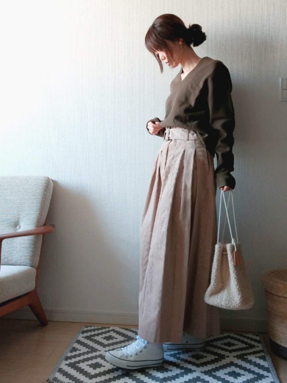 『カーキ × ベージュ』 ボリュームスカート、ハリハリコーデュロイで お気に入り 昨日、部屋の模様替えをしました。 引っ越してきてから なんだかずーーーと 落ち着かなかった。 その原因は、バカでかいソファーのせいだったー リビングから移動してきました。 家具は、上海に行く前に買ったもの達。 まさか海外勤務になるなんて思ってなかったから😵 家具ってその家に合わせないと難しいね。