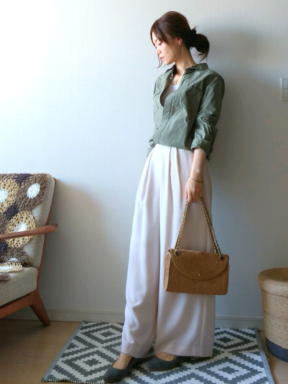 『ライトカーキ × ピンクベージュ』 昨日のコーデの上下逆バージョン。 ライトカーキのミリタリーシャツは 裾を交差してカシュクールっぽく。