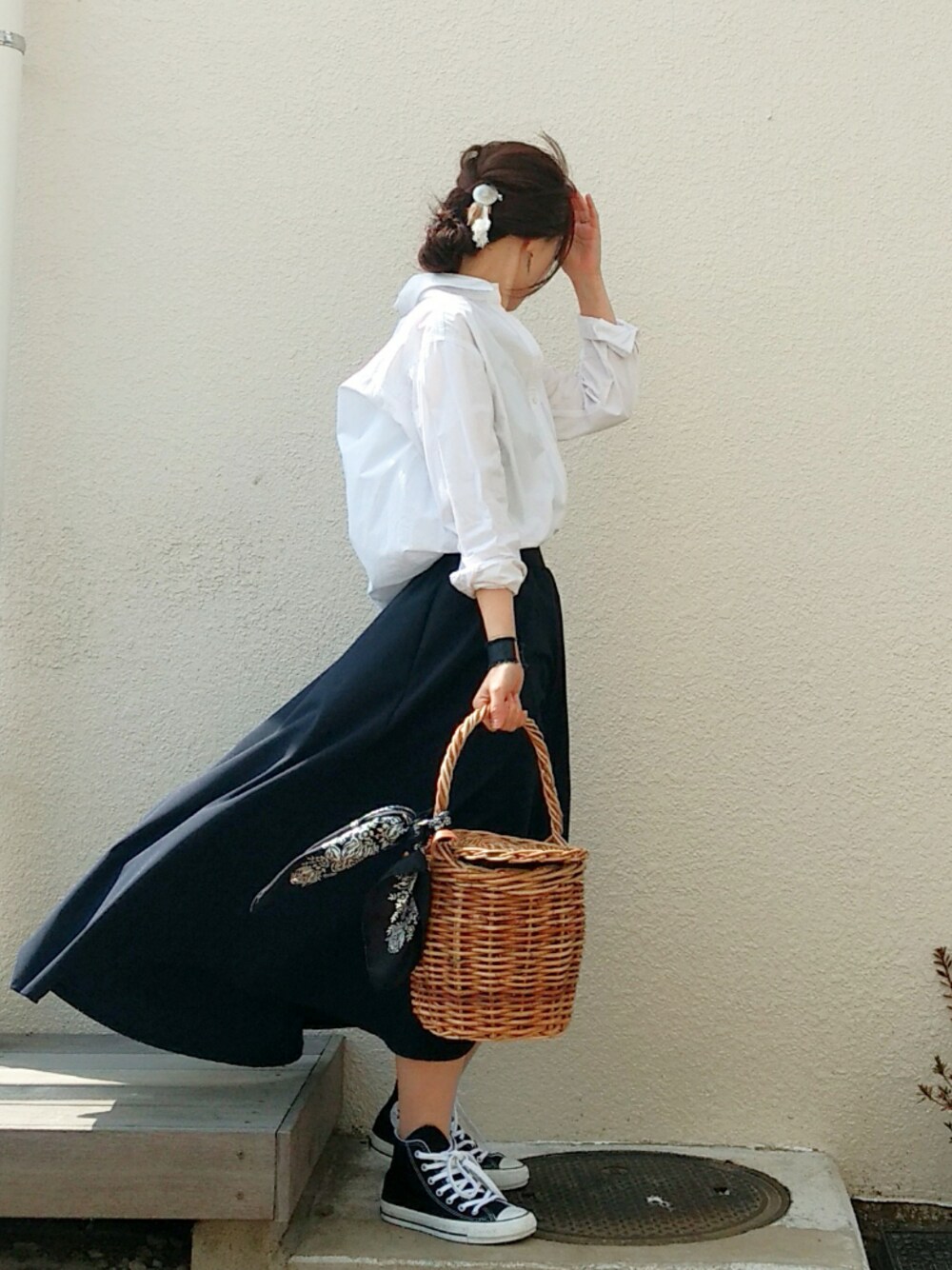 ご覧いただきありがとうございます 『ホワイト × ネイビー』 すごい強風で外撮り断念しそうになりました。 本当は、スカートの裾が後ろさがりなのに まったくわからない…