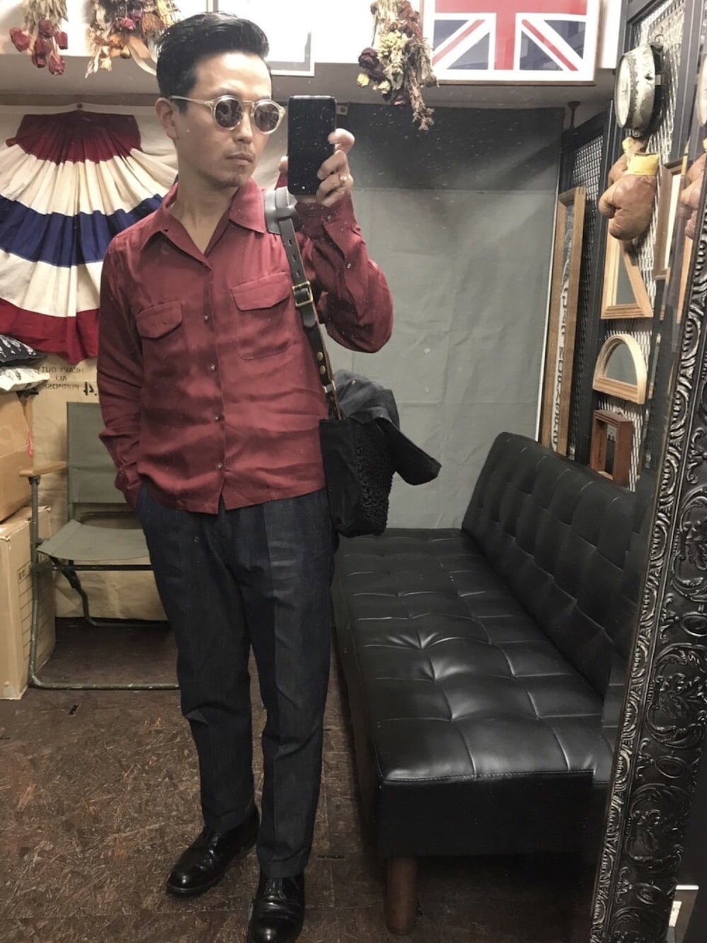 秋にピッタリなレーヨンシャツとデニムスラックスを合わせたアダルトなスタイル。今日は、ヴィンテージのオフィサーシューズで全体を引き締めました。