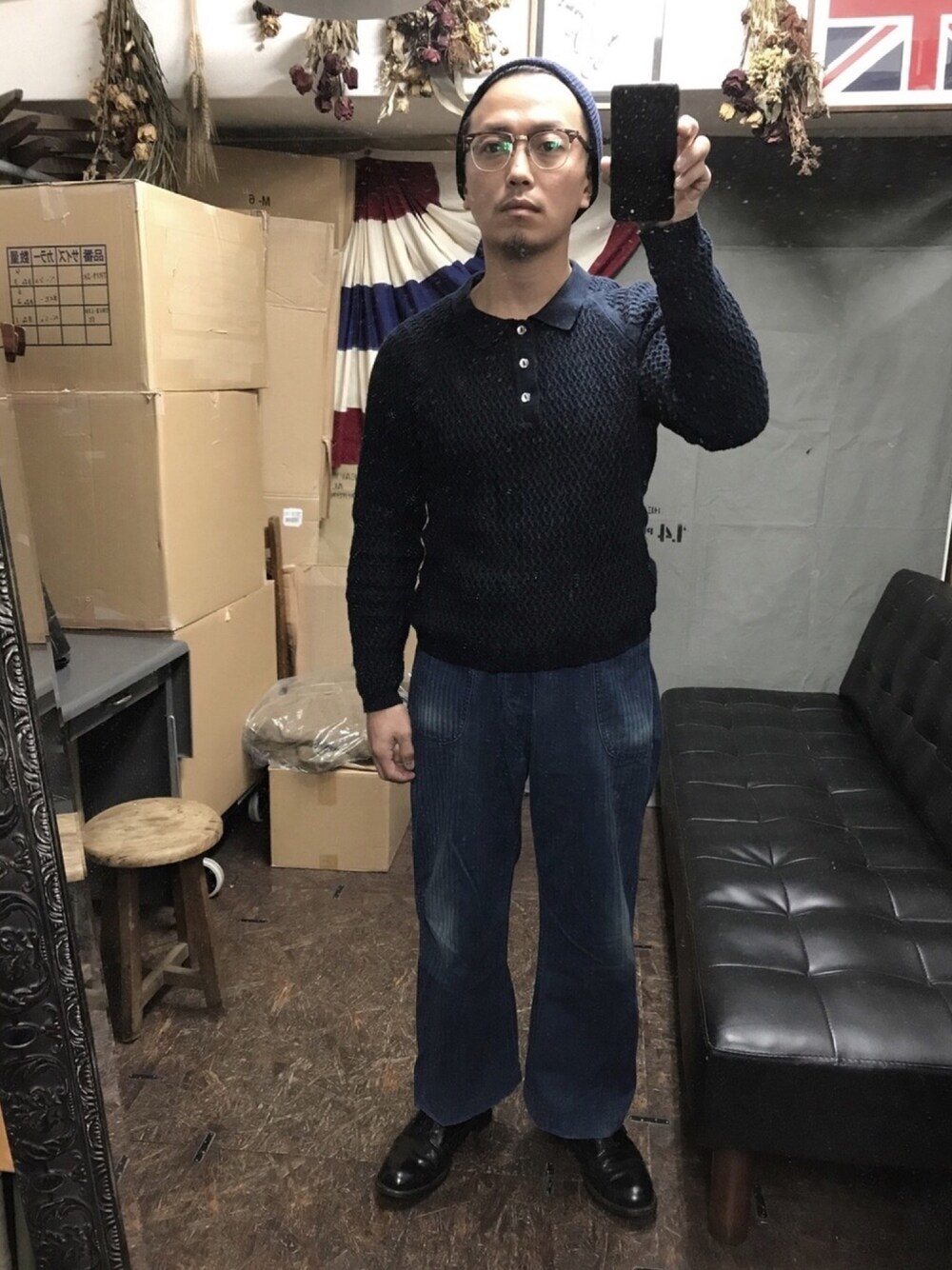 同色のネイビーカラーで合わせました。タイト目なニットポロセーターとワイドなパンツが相性良しです。