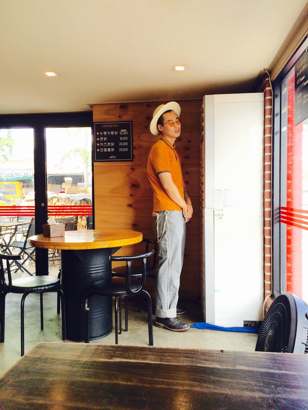 オレンジ系のポロシャツを着用したメンズの秋コーディネートの1枚目の写真