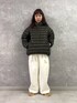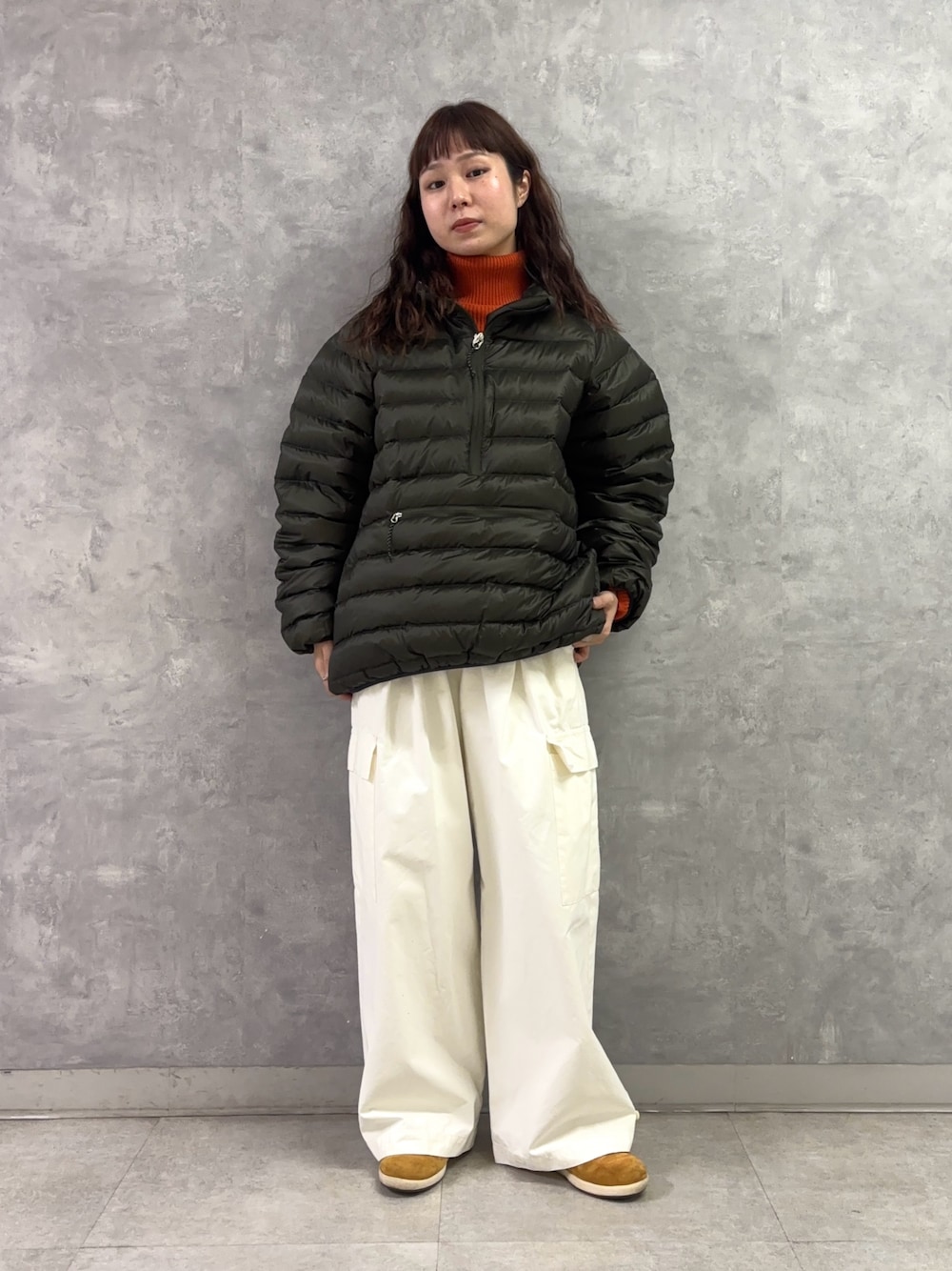 メンズアイテム「ENDS and MEANS Light Down Pullover Jacket 」を使用したミリタリーコーデ こなれた雰囲気を持つオリーブブラウン。 地味になりすぎないようインナーにはオレンジカラーのタートル、ボトムには白のユーティリティーパンツを合わせ、テイストは貫きつつも女性らしい纏いに仕上げたところがポイント。 ダウンなのにハーフジップ。そんなさり気ないアクセントがあるだけで、着ていてワクワクします♩