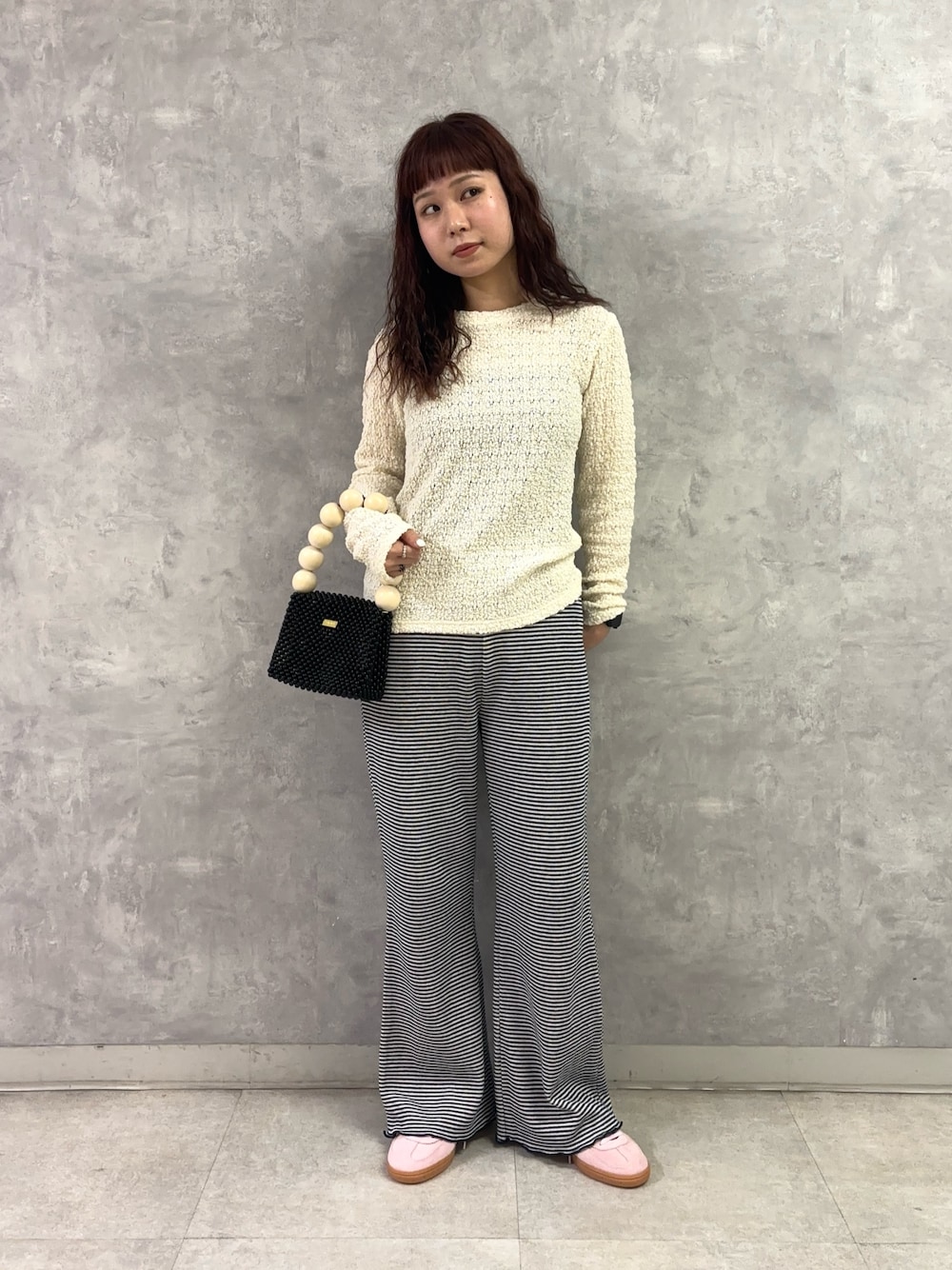昨年も人気のあった「ポコポコレースロングTシャツ」 透け感ほとんど気にならないので、インナー使いだけでなく1枚でも着やすいです◎ 今回はリブフレアパンツ合わせでレディライクな気分でしたが、デニムやトレーナーなどのカジュアルアイテムと合わせてもギャップが可愛いのでおすすめです🪽