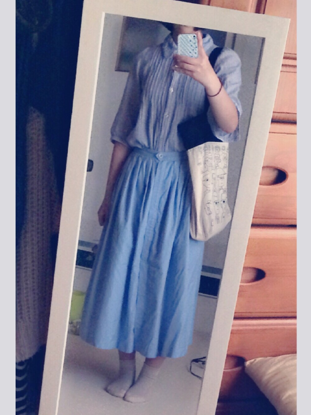 トップス/スカート どちらも古着 大好きな青で着飾りました トートバッグ:didizizi 靴下:靴下屋 Tabio