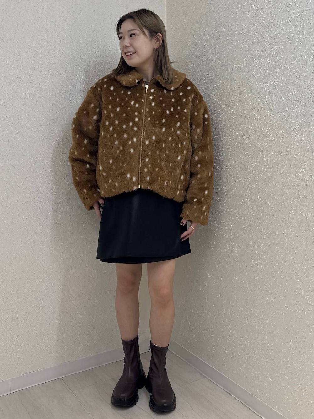 バンビ柄かわいすぎる♡ シンプルになりがちなアウターも柄物取り入れるだけで一気にオシャレ感up✨ しかもファーの部分が取り外し可能なので、その日の気分に合わせて雰囲気変えられる!🙆‍♀️