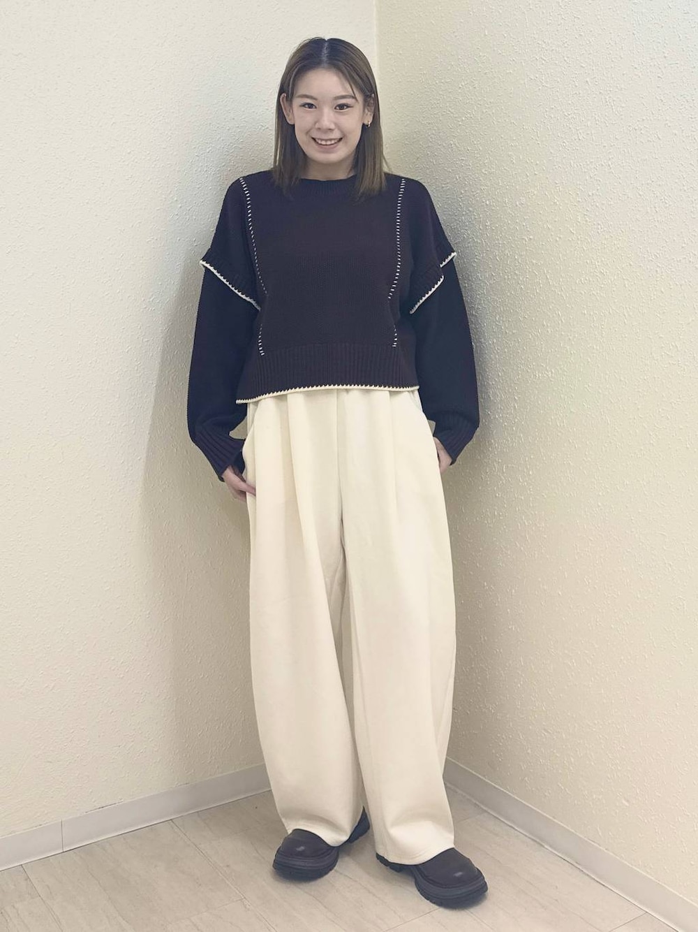 ★tops Fサイズ着用 前後2wayで着れちゃうメランジニット! お洗濯もがんがんいけちゃうしなによりステッチがかわいいです♡ ★bottom Fサイズ着用 スウェット素材のパンツ。 めちゃめちゃ軽くてコクーンシルエット+タックが はいってて形も綺麗です! 1度履いたら手放せなくなるくらい履き心地抜群です!