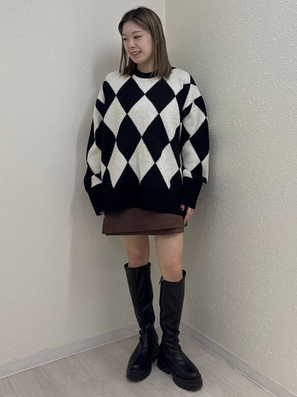 主役ニットの日。 甘くなりすぎないように、ブラウン×ブラックで大人めにまとめました🖤 ロングブーツで脚元しめるのおすすめ!