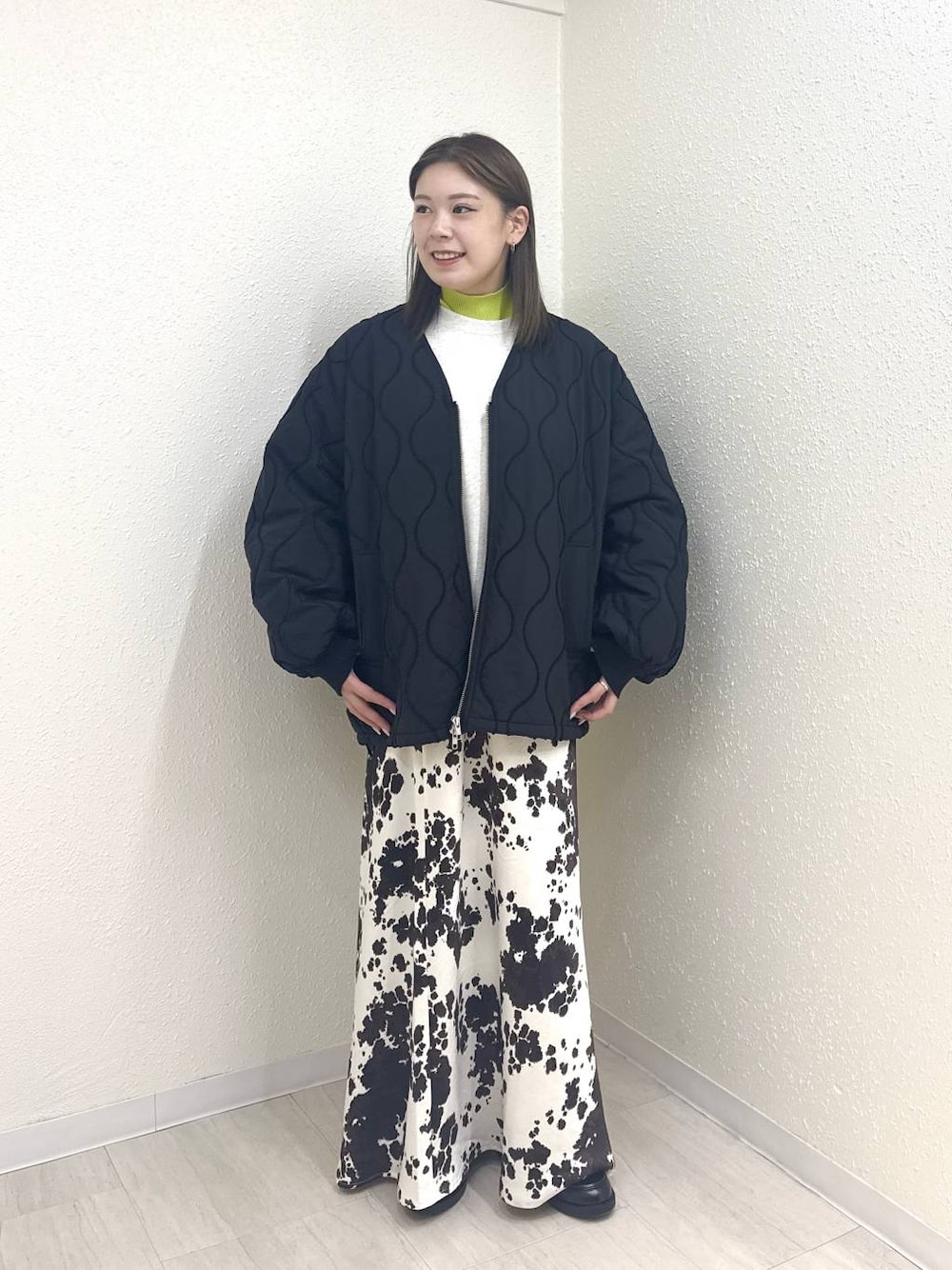 キルティング×柄スカート 154センチ アウターFサイズ着用 トップスFサイズ着用 インナーFサイズ着用 スカートSサイズ着用
