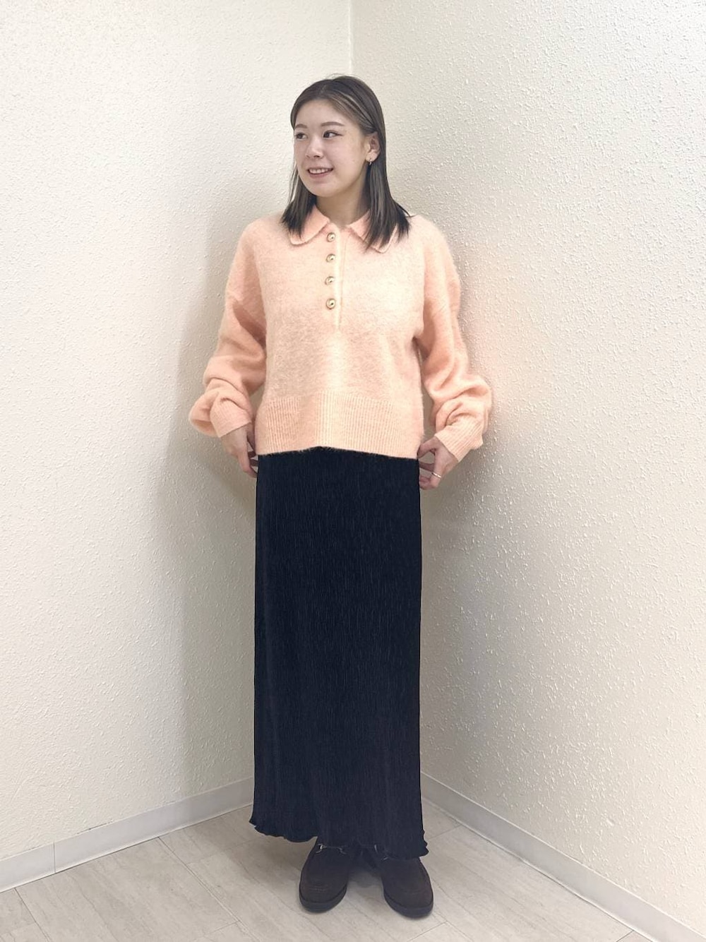 販売初日から大人気のポロニット!! ヒートテックいらないくらい室内だとあたたかくてお洗濯しても毛玉なりにくい! 154cm トップスFサイズ着用 ボトムスFサイズ着用