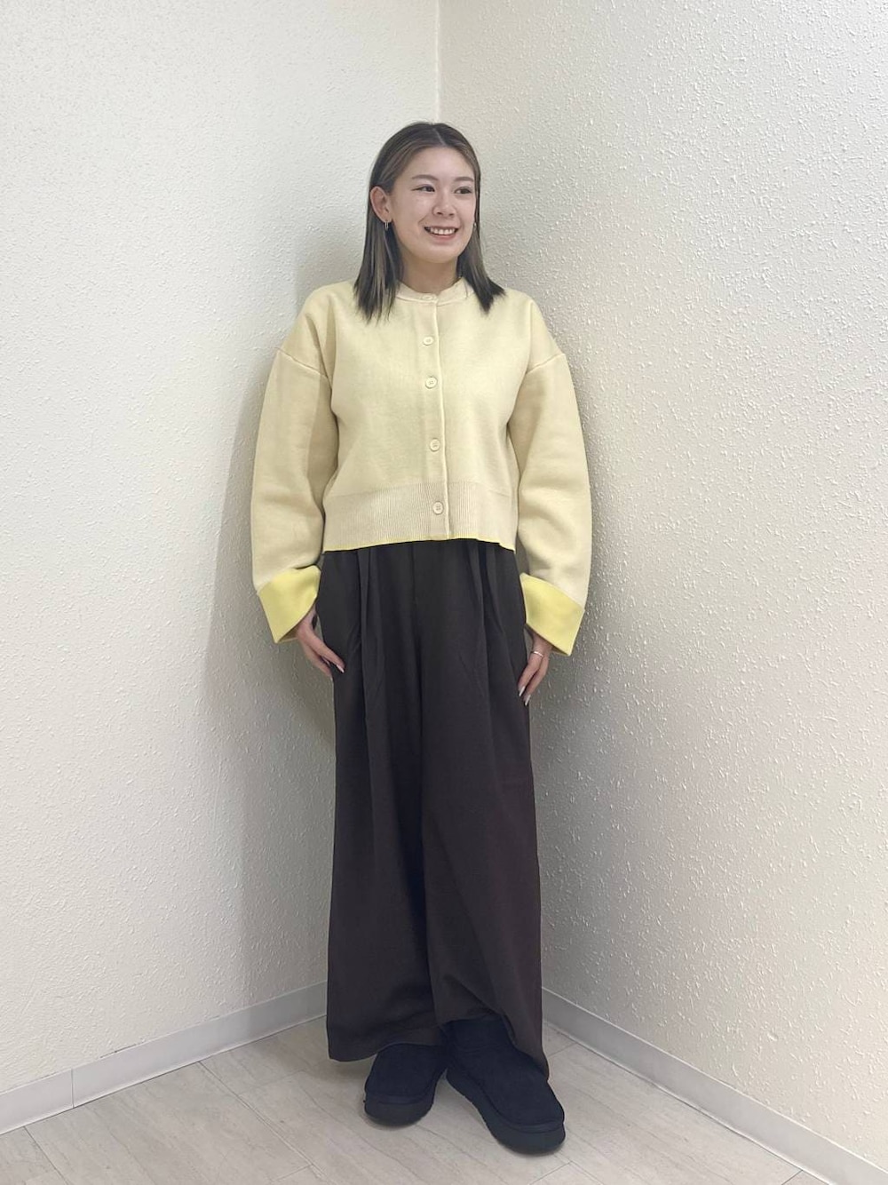 黄色×イエローがかわいすぎる 春コーデにぴったり! 中にタートルネックを着て、寒さ対策×おしゃれ楽しむのもいいよね! 154cm トップスFサイズ着用 ボトムスMサイズ着用